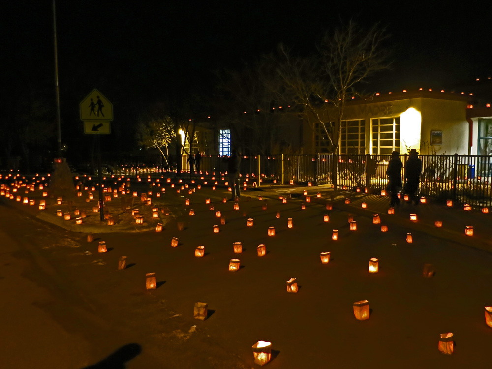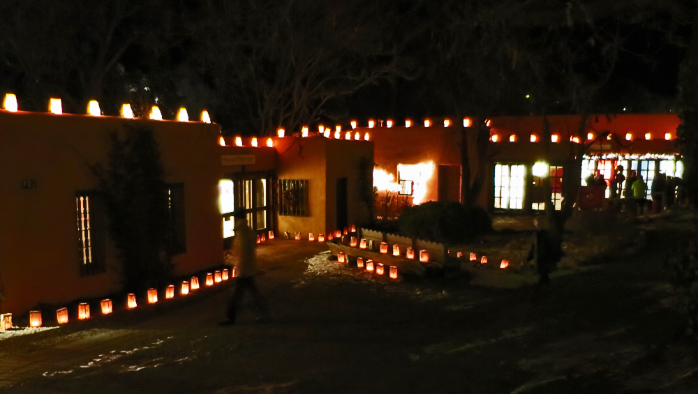The Farolito Walk is focused around Canyon Road, but Acequia Madre and much of Garcia Street are also lined with farolitos and luminarios. Many festive revelers process around a large loop starting at the bottom of Canyon Road, proceeding up to Monte Sol and then looping back down Aceqia Madre. The smell of burning piñon and both familiar and unfamiliar Christmas carols invite lingering. Strangers greet one another with spirited holiday wishes, and galleries offer treats and a chance to view art by night.